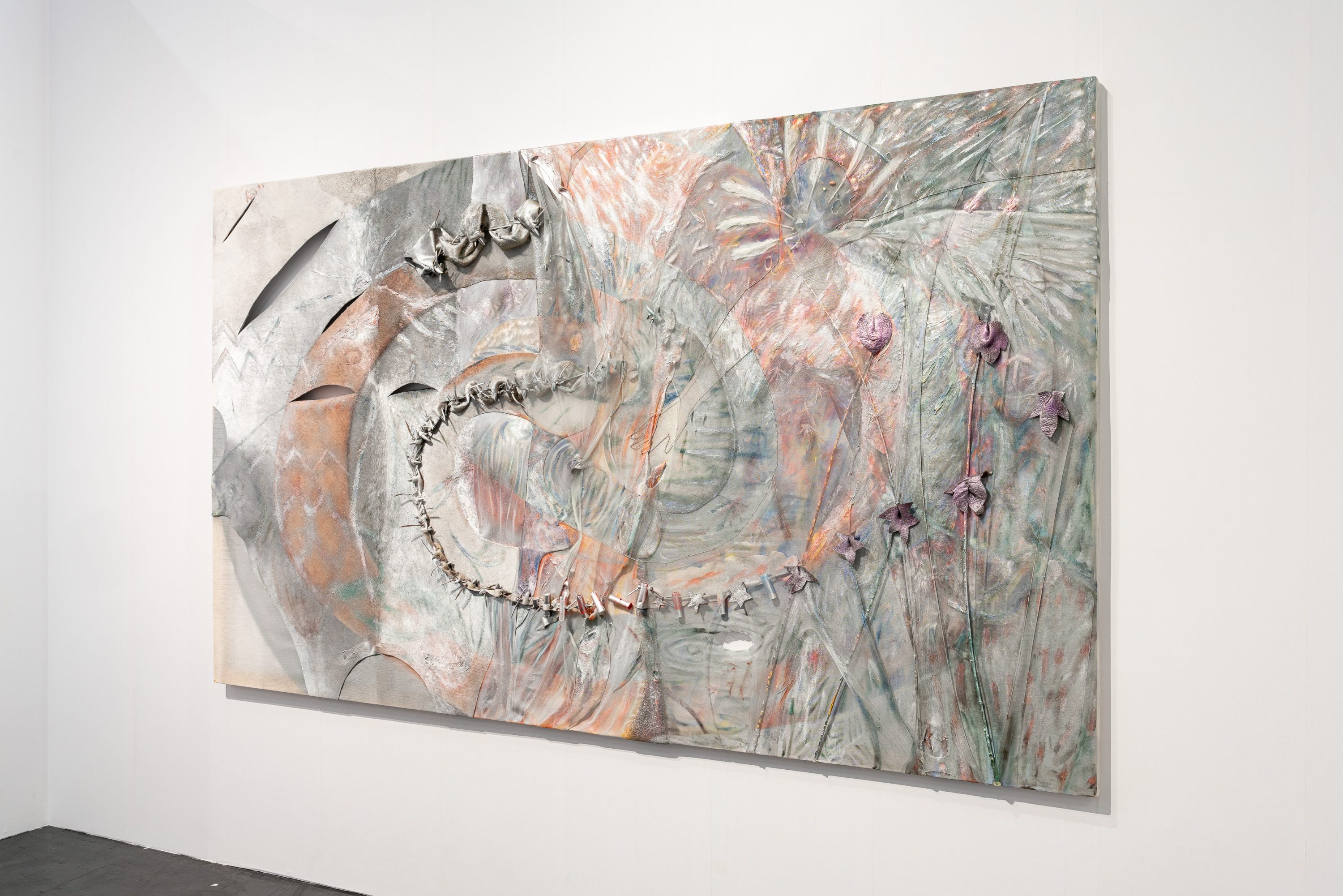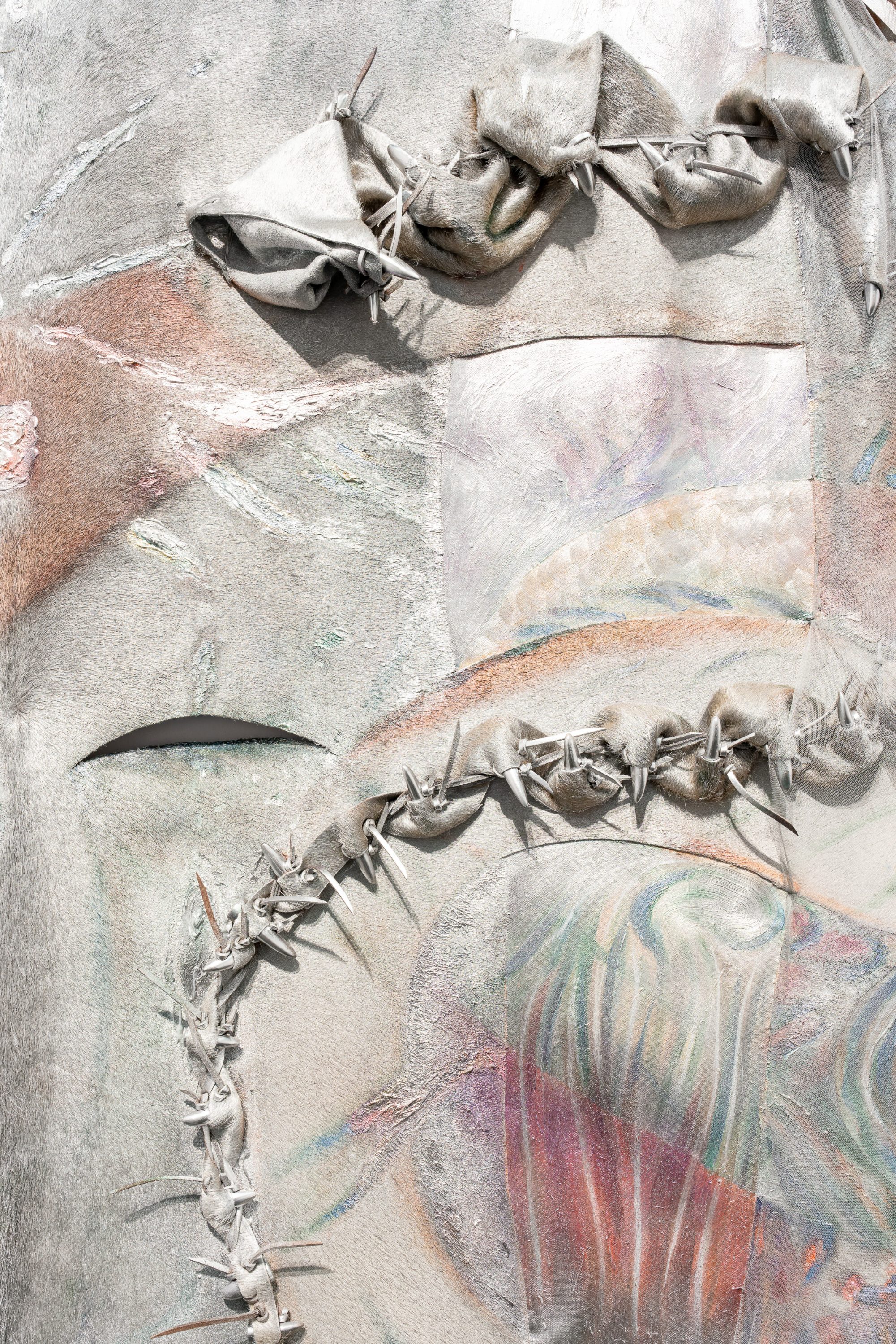Öl, Pigment, Acryl, Effektlack auf Rindsleder, Gaze, Weide, Künstlerjacke, Lammfell, gefundene Federn, Knebelknöpfe aus Büffelhorn von Burberry, Abalone, Perlen, Samen der Digger-Kiefer, Dentalium (Schneckenhäuser), Spiegel, Stahlkugelkettchen