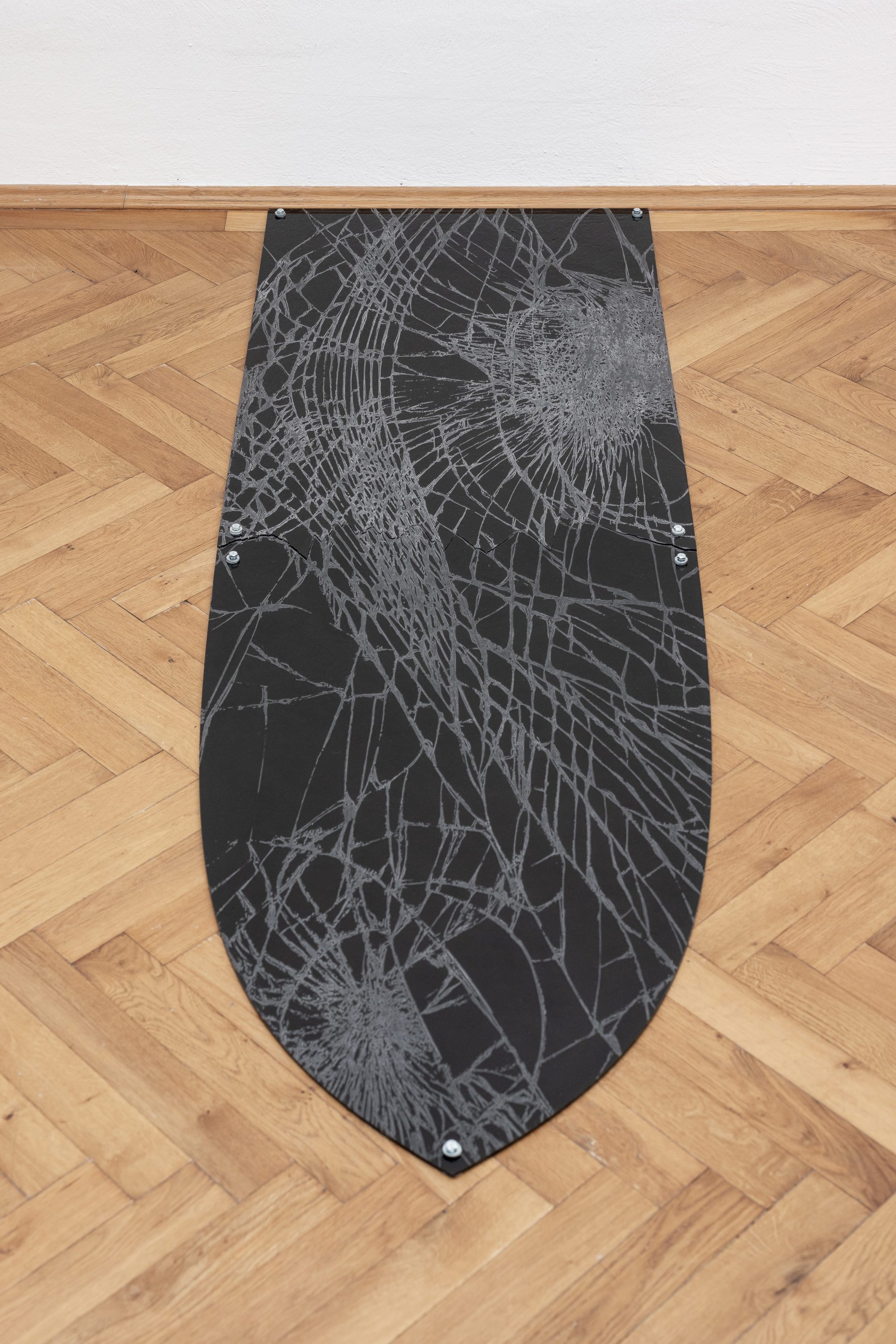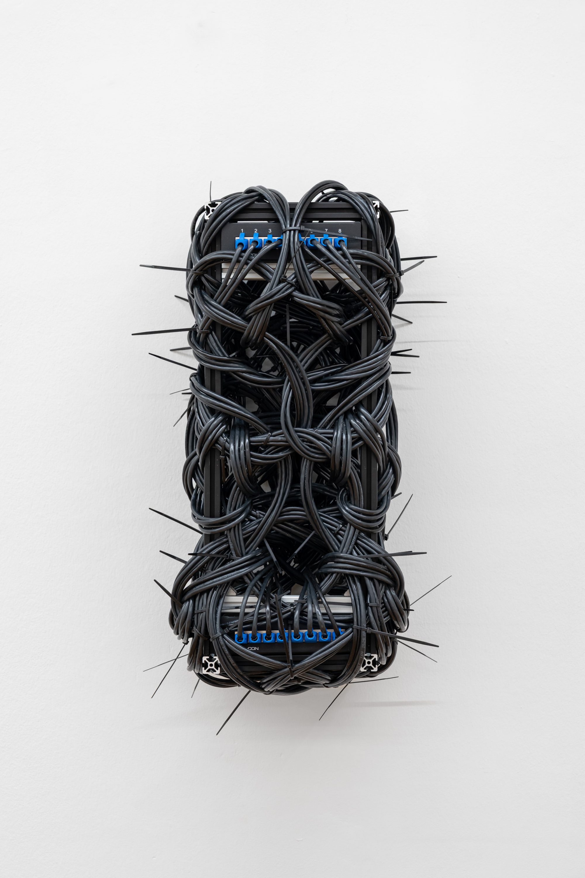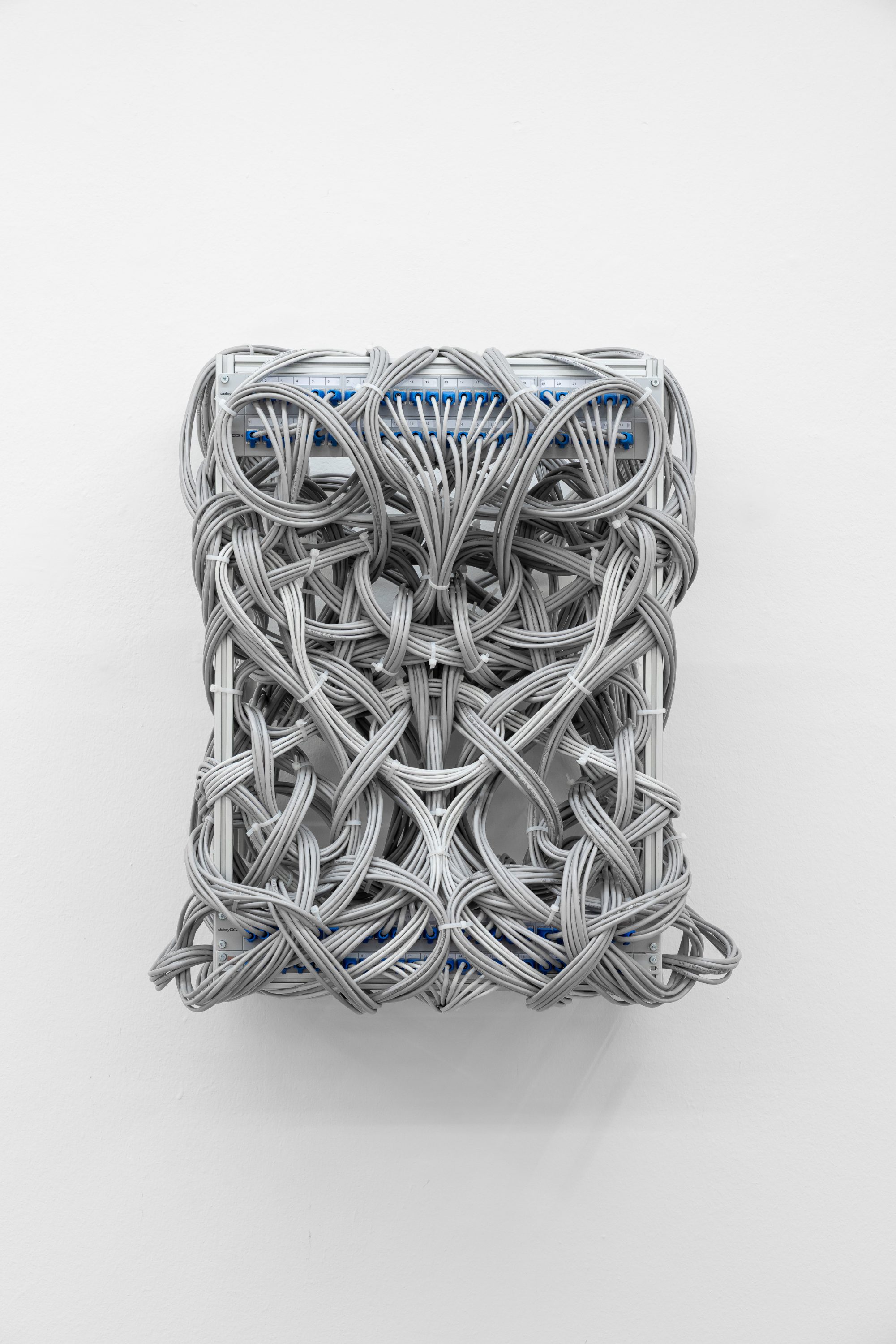 Spectrophilia, meaning the sexual attraction to spirits, is used here with a double entendre – not only referencing specters, but also the radio frequency spectrum. This collection of sculptural and printed works from Sarah Friend use various industrial and technical materials to evoke the ghostly. Twisted cables, a baroque intensification of what reddit called “CablePorn”, become like veins or entrails. Broken black mirrors speak to an afterlife of devices, fractured gazing pools, and gravelike stillness. And the series of printed mirrors, Dream House, feature images generated by one of Friend’s custom made machine learning models, where she has removed her own avatar. What remains is only the empty beige house as imagined by statistics – strangely lacking specificity or personality, but of course, haunted.
