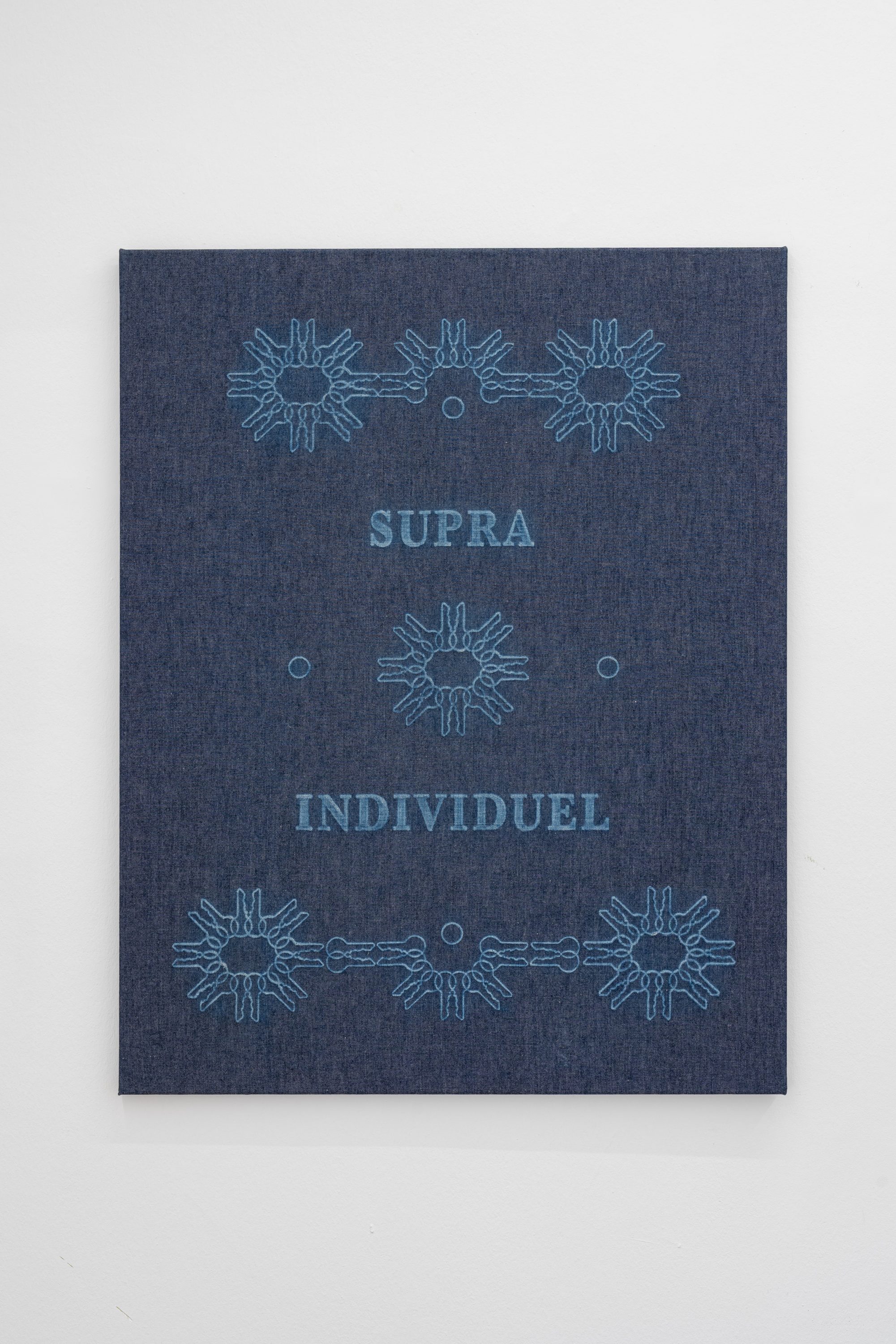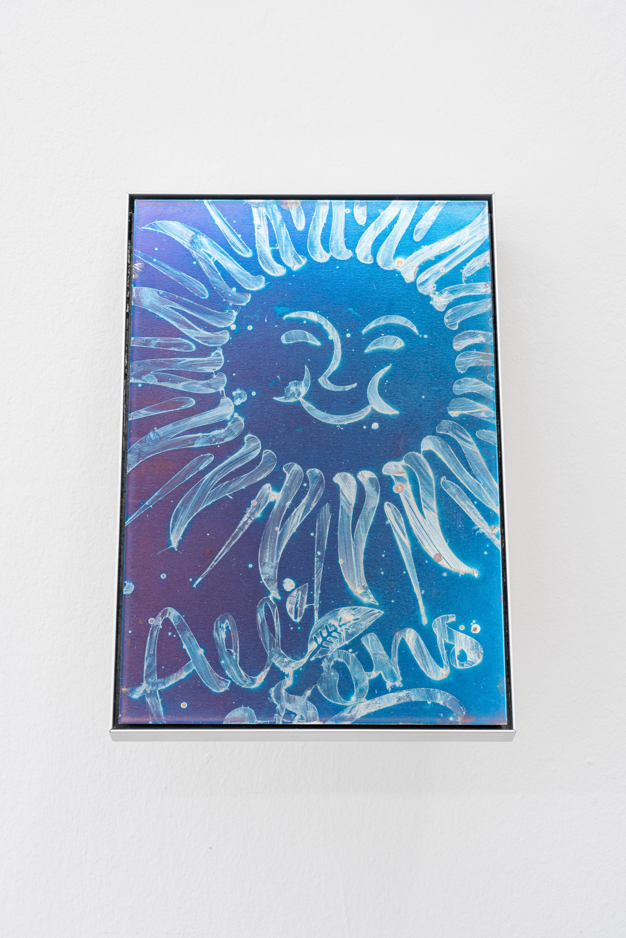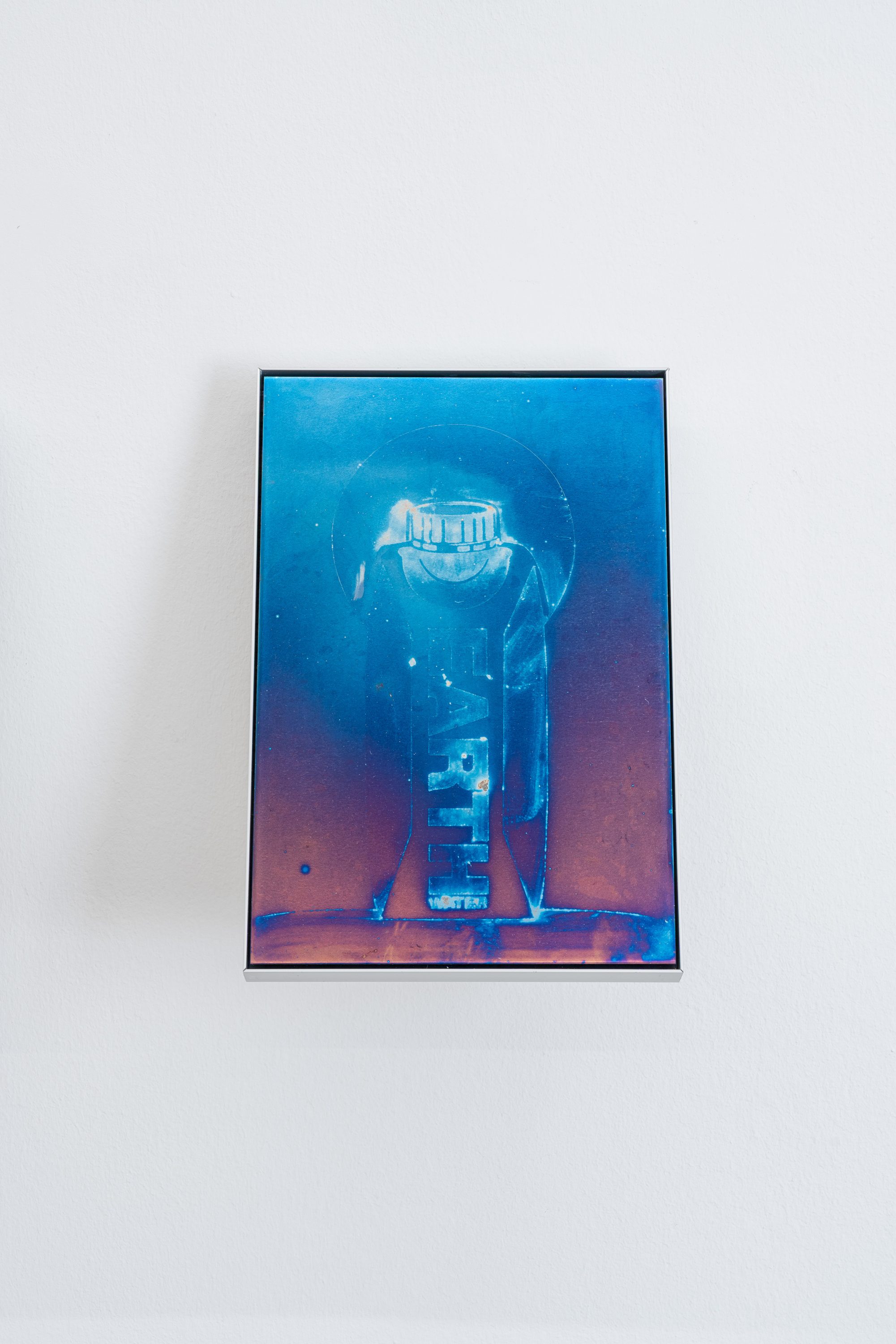 Small Language Models brings together two bodies of work. The two denim pieces Sentiments and Supra-Individuel, feature texts and impressions of objects rubbed into the fabric, resembling the outline of a smartphone that is consistently worn in the same pocket of person’s favorite jeans. These two works are paired with Lahuis’ most recent series, titled Calorgraphs. This series consists of oxidized metal plates that are heated until 300 degrees and onto which the artist has drawn images using sweat. Calorgraph combines the Latin word for heat with the suffix -graph, commonly associated with graphic reproduction techniques. The works reflect on heat, atmospheric conditions and the representation of nature through products. Both series of Small Language Models ground the reproduction of information in natural processes and the body.
