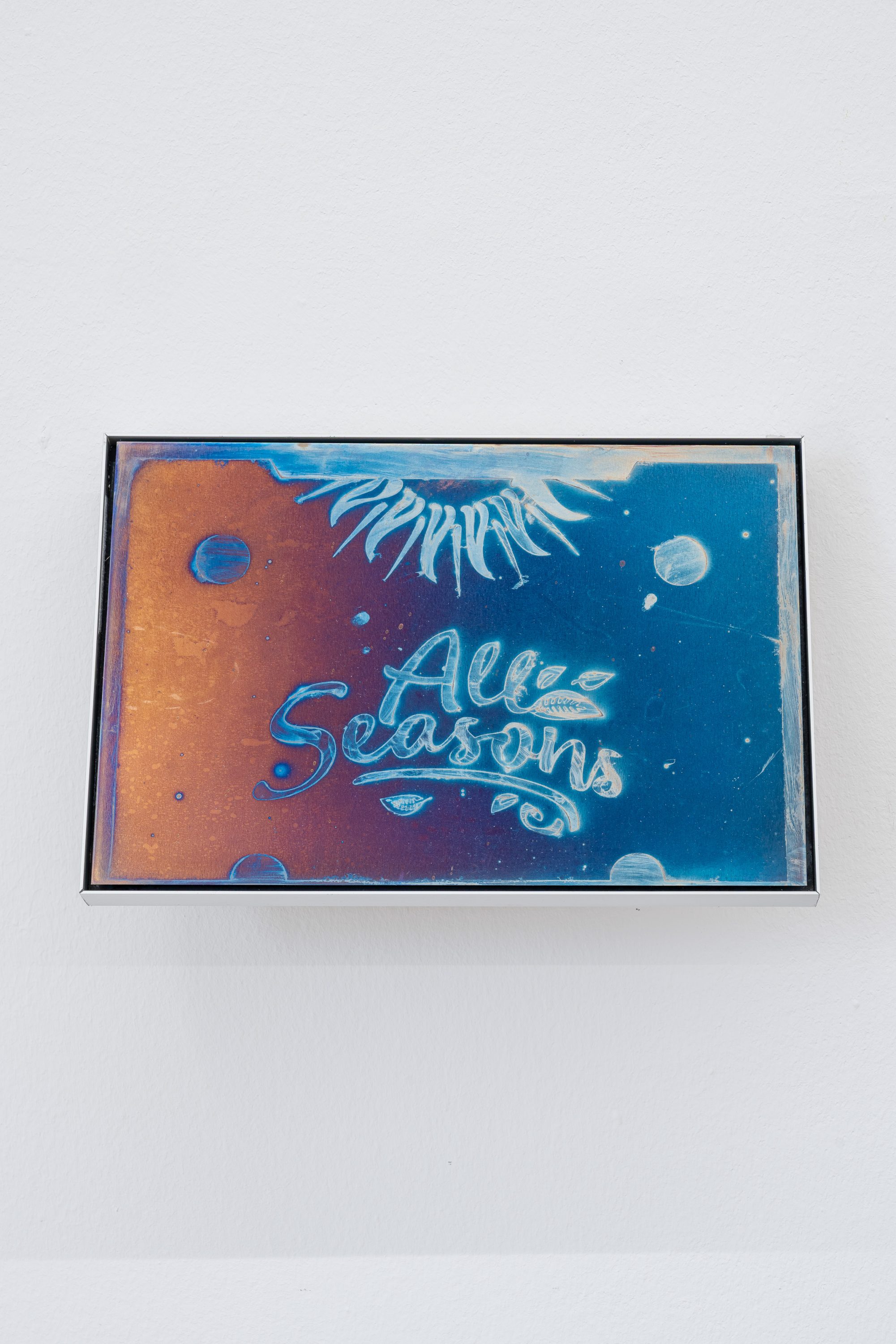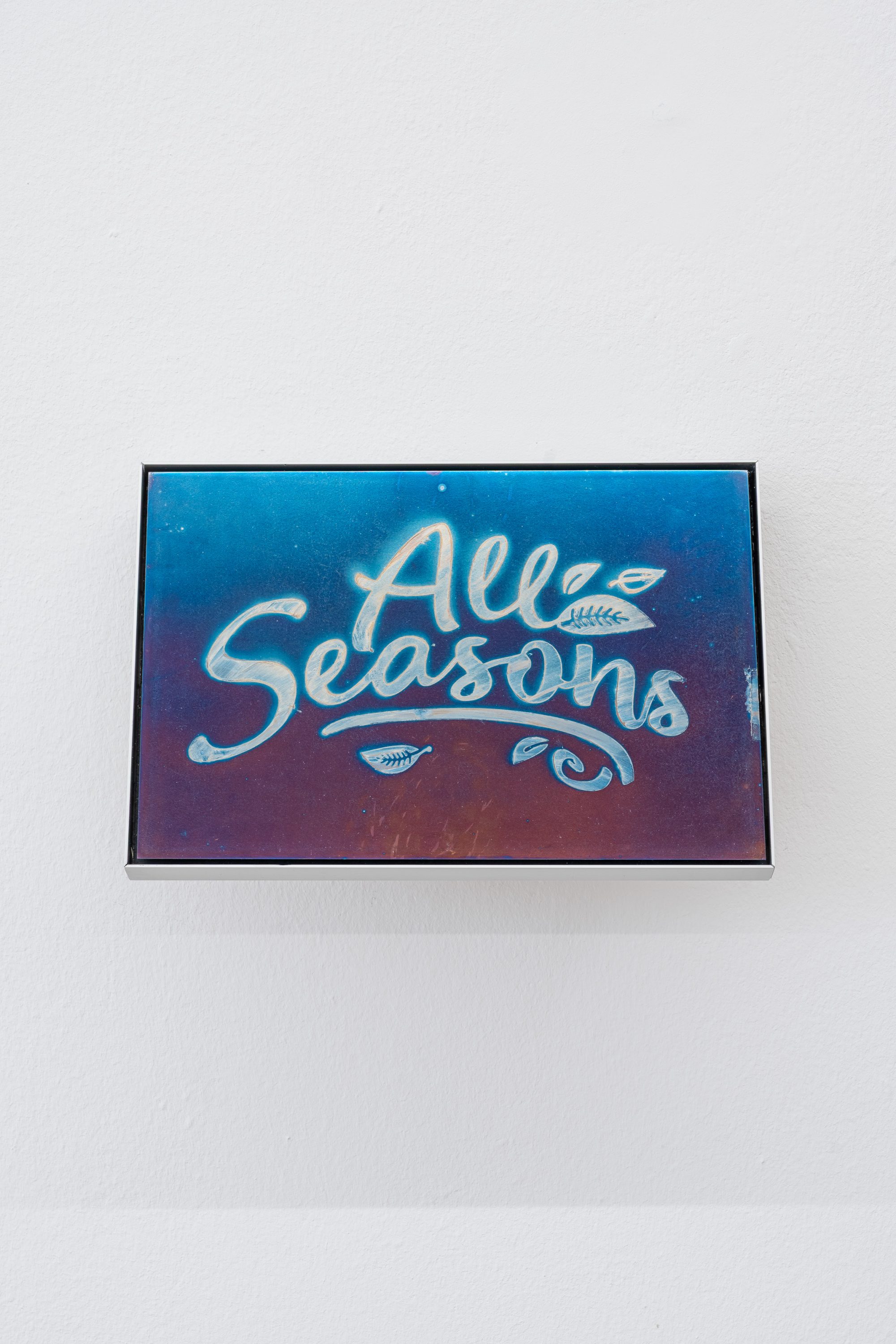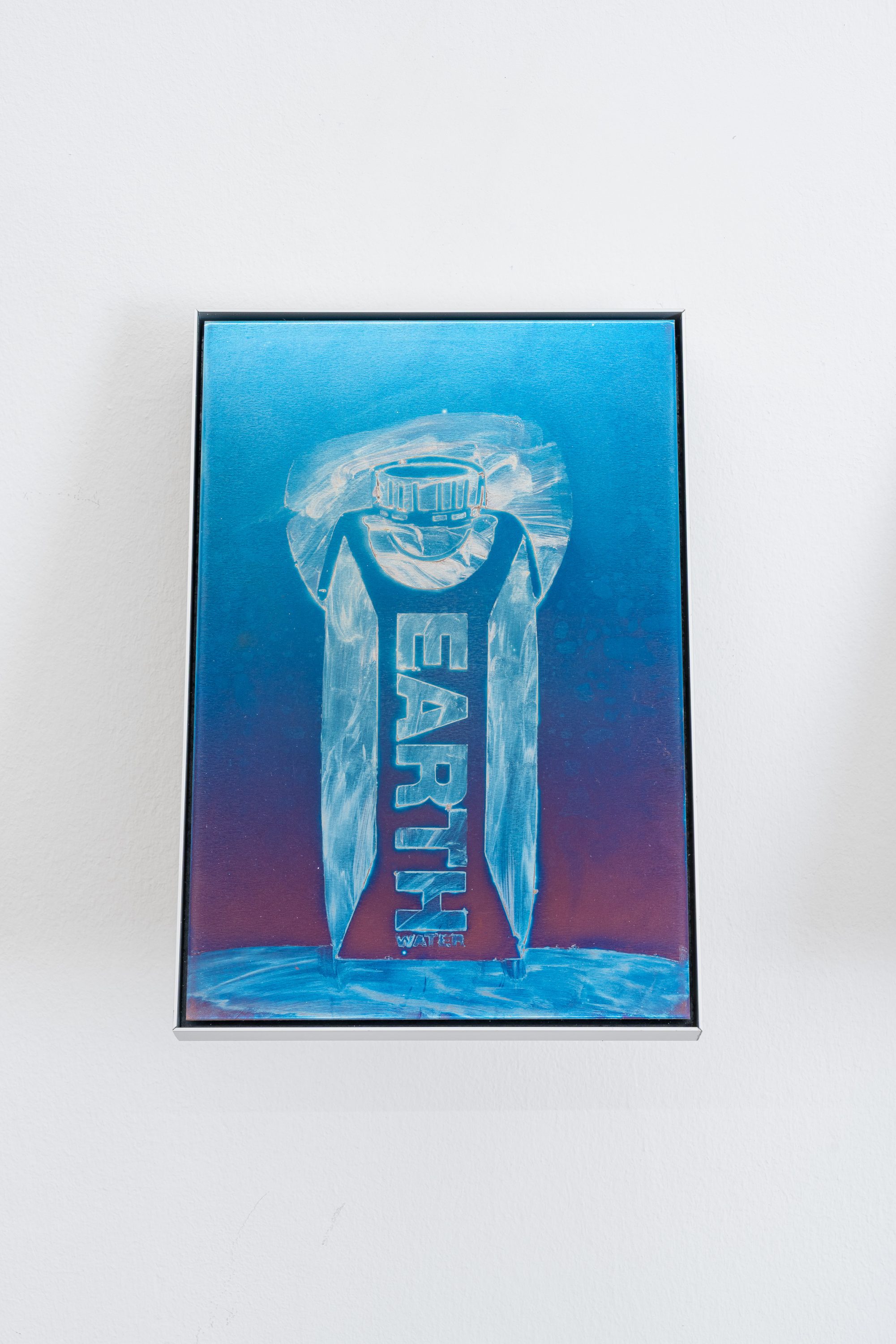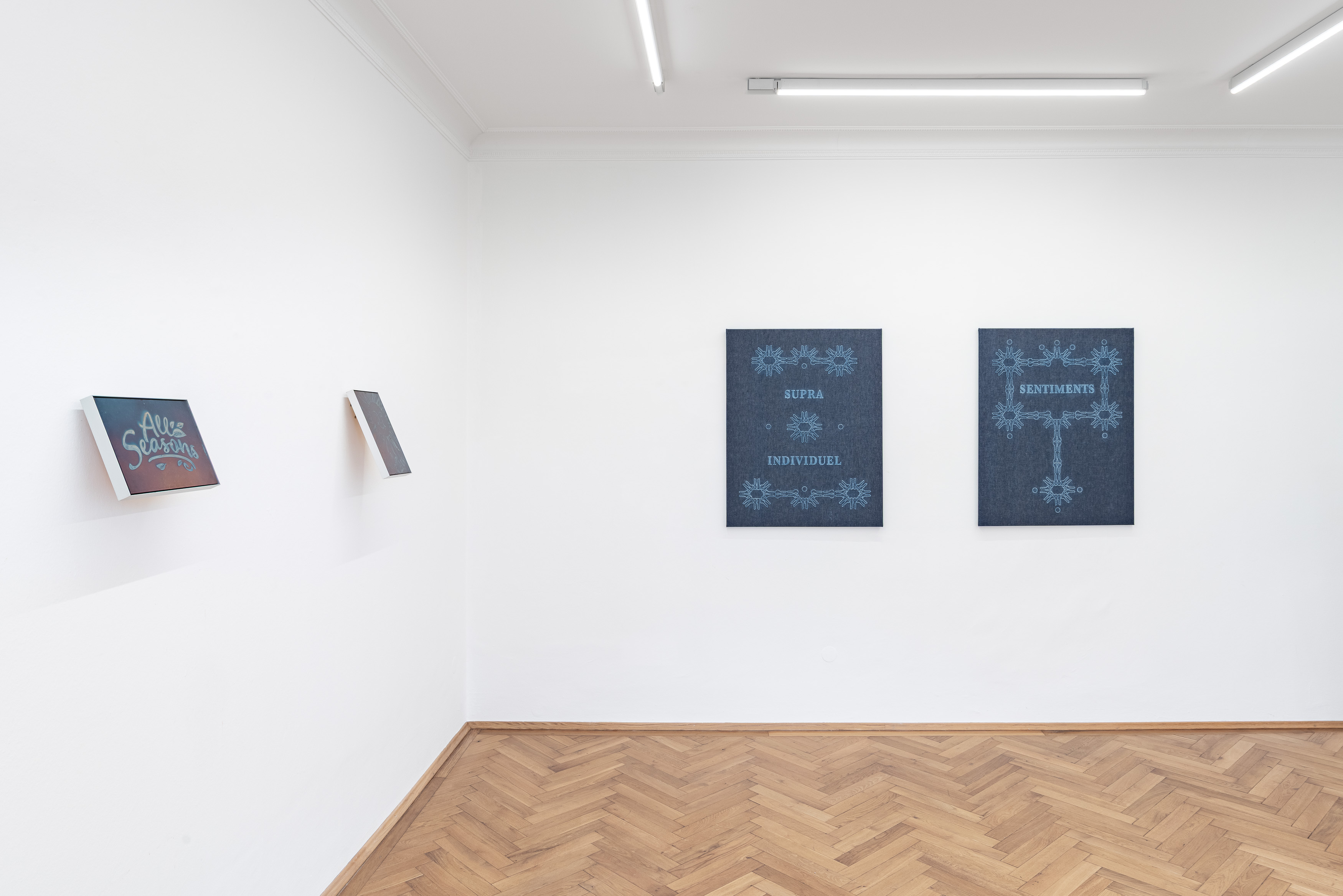 Small Language Models brings together two bodies of work. The two denim pieces Sentiments and Supra-Individuel, feature texts and impressions of objects rubbed into the fabric, resembling the outline of a smartphone that is consistently worn in the same pocket of person’s favorite jeans. These two works are paired with Lahuis’ most recent series, titled Calorgraphs. This series consists of oxidized metal plates that are heated until 300 degrees and onto which the artist has drawn images using sweat. Calorgraph combines the Latin word for heat with the suffix -graph, commonly associated with graphic reproduction techniques. The works reflect on heat, atmospheric conditions and the representation of nature through products. Both series of Small Language Models ground the reproduction of information in natural processes and the body.