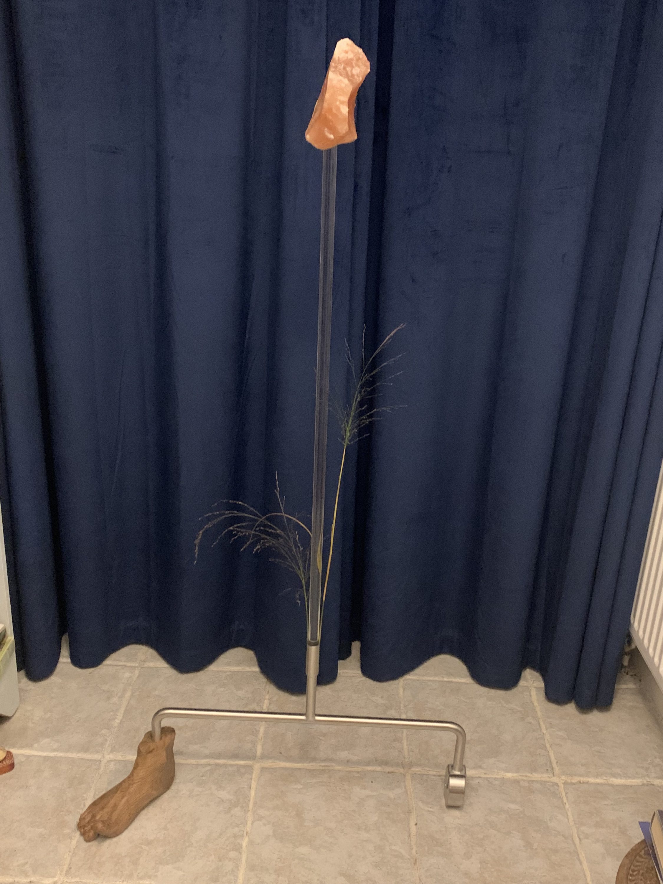 horse salt lick sculpted by miniature Shetland ponies, Síofra, Alannah, Bob and Sean, at Festina Lente Equine Therapy centre, Bray, Ireland, carved ash wood modelled on the artists’s foot, glass, stainless steel wheel,stainless steel two grasses from Wexford, Ireland